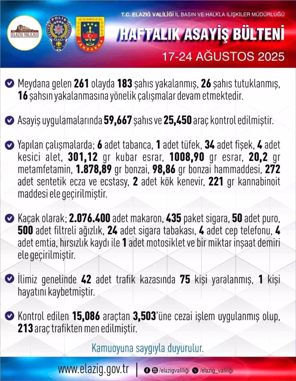 Elazığ Valiliği, 17-24 Ağustos 2025 tarihleri ortasındaki haftalık asayiş datalarını açıkladı. Kent genelinde meydana gelen 261 olayda 183 kişi yakalanırken, 26 kişi tutuklandı. Çalışmalarda 59 bin 667 şahıs ve 25 bin 450 araç denetlendi. Denetim edilen araçlardan, 3 bin 503’üne cezai süreç uygulanırken 213 araç da trafikten men edildi.