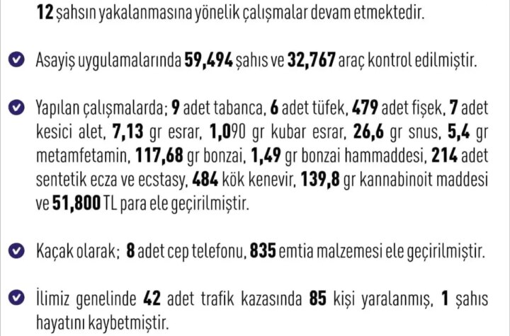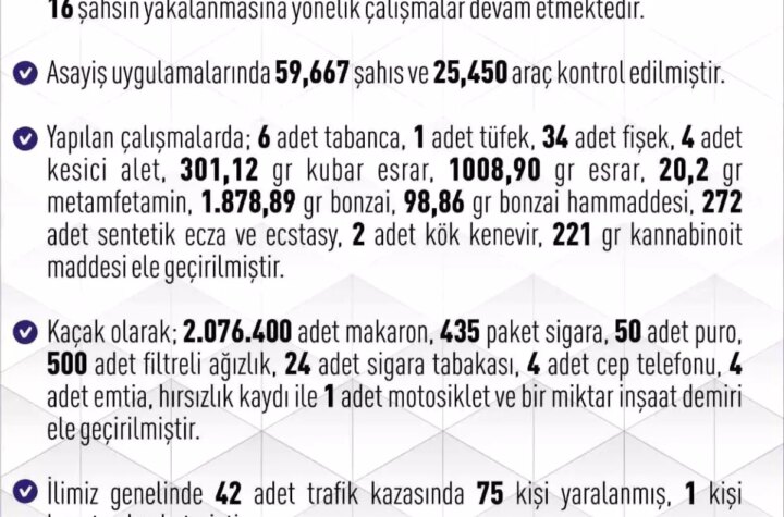 Elazığ'da 7-14 Eylül 2025 tarihleri ortasında gerçekleştirilen asayiş uygulamalarında toplam 268 kişi yakalandı. Uyuşturucu...